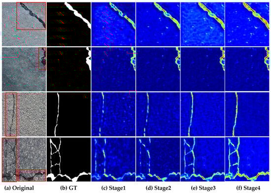 The proposed CAFANet effectively identifies a diverse range of road damage images in the RCD task. As shown in Figure 7, to further demonstrate the superior performance of CAFANet, the CLI module’s four stages are visualized and analyzed using attention images. Lower attention values are blue and higher attention values are red. A red box marks the crack region in the original image.