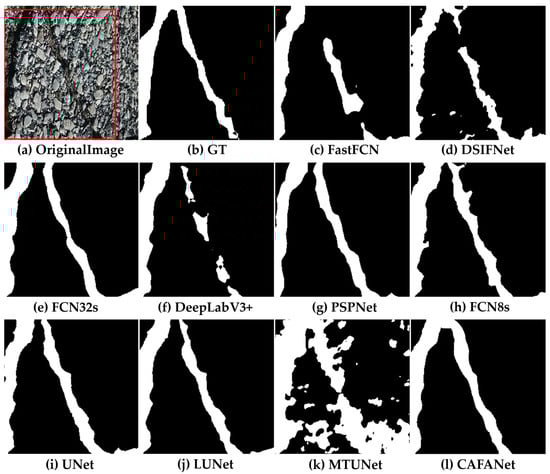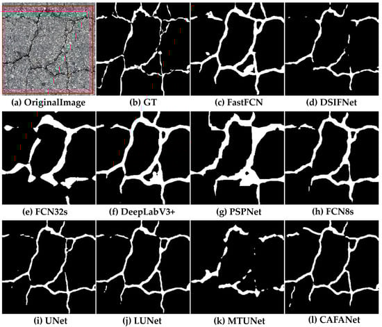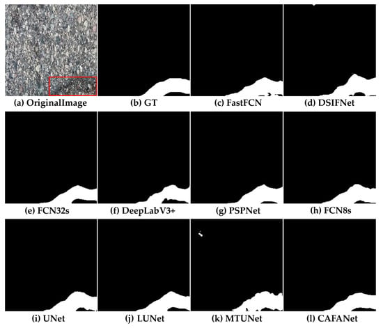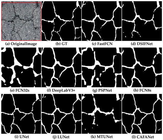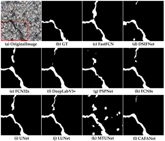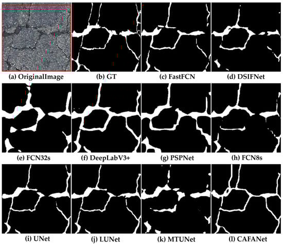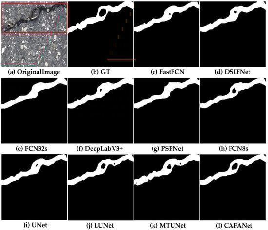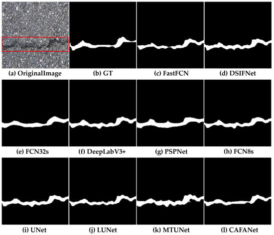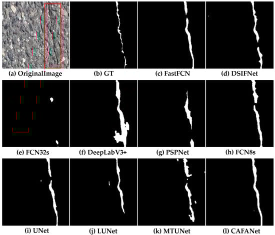 In this section, we conduct a comparison between our approach and a baseline method. Figure 8, Figure 9, Figure 10, Figure 11, Figure 12, Figure 13, Figure 14, Figure 15 and Figure 16 show the results of segmentation for road damage by various methods. We mark the transverse cracks in the original image with a red box, while the white outlines of the label and segmentation maps represent the damaged region of the road, and the black region forms the background. Among them, Figure 8, Figure 9 and Figure 10 show the comparison results between CAFANet and the comparison method with segmental transverse cracks of the road, while Figure 11, Figure 12 and Figure 13 show the comparison results between CAFANet and the comparison method with segmental longitudinal cracks of the road. Figure 14, Figure 15 and Figure 16 show the comparative results between CAFANet and the comparison method in segmental road mesh cracks. Figure 8, Figure 9, Figure 10, Figure 11, Figure 12, Figure 13, Figure 14, Figure 15 and Figure 16 show that using the CLI module and FAB produces a good segmentation result, while other methods perform slightly worse, indicating they approximate the effective characteristics of road damage segmentation. A multi-scale feature interactive learning approach is more effective at segmenting road damage than other large-scale models, indicating that CAFANet provides better segmentation than the mainstream models. We can see that the segmentation results of CAFANet are significantly more complete than those obtained by other methods. In addition, CAFANet makes it possible to segment the image more accurately than other methods, with most of the damaged regions being correctly segmented. This indicates that the CLI module and FAB are helpful in improving CAFANet’s feature extraction and recognition. To summarize, the visual results depicted in Figure 8, Figure 9, Figure 10, Figure 11, Figure 12, Figure 13, Figure 14, Figure 15 and Figure 16 provide clear evidence that CAFANet excels in segmenting road damage images, outperforming the baseline methods to some extent.
