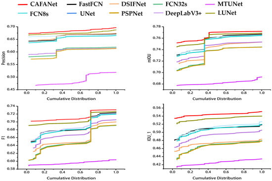 As an additional measure highlighting the exceptional performance of the proposed method, we perform segmentation detection on 141 images using CAFANet and baseline methods. It is shown in line graphs in Figure 17 for four metrics: F1 score, mIOU, Precision, and IOU_1. A curve with points (x, y) indicates that 100% * x % of images have metrics that do not exceed y. By comparative analysis of these metrics, we can evaluate the performance of different methods for road crack detection and determine whether CAFANet is optimal.