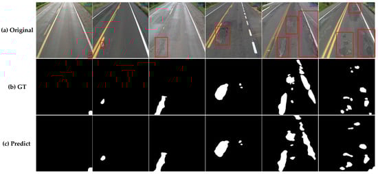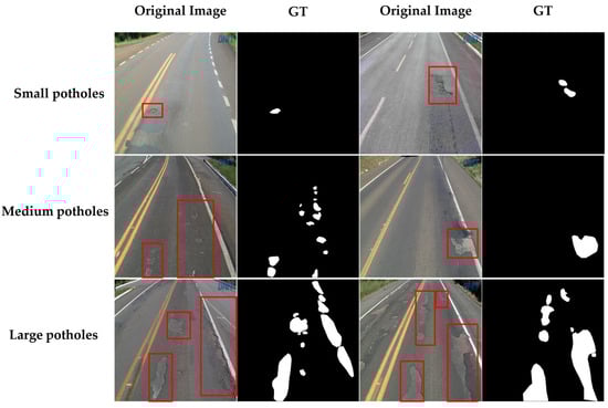 The Cracks and Potholes in Road Images Dataset (CPRID) [] serves as the primary dataset for this research, offering a comprehensive and widely utilized dataset specifically designed for road crack detection and analysis. It consists of a diverse collection of high-resolution road images annotated with cracks and potholes. The CPRID contains approximately 2235 images. We partition it into training, validation, and test sets in a ratio of 5:1:4, similar to the division in CRACK500. In total, we obtain a training set with 1118 images, a verification set with 223 images, and a test set with 603 images. In the road damage images, the pixel values corresponding to the length and width of potholes are also different. According to the label image of the source image (the white area is the pothole, the background area is black), the corresponding pothole pixel value can be calculated. Finally, through a comparative analysis of the sizes of all pixel values, potholes with pixel values below 10,000 pixels are defined as small potholes, those between 10,000 and 30,000 pixels are defined as medium potholes, and those above 30,000 pixels are defined as large potholes. Figure 18 shows some examples of potholes.
