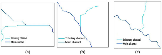 A parallel channel is actually a parallel (or approximate parallel) channel segment that may occur near the intersection point of the two channels. The parallel channel is actually an unreasonable channel section that extended along the main channel because of the flat surface, which prevents the two channels from merging at a proper position. It should be noted that parallel channels do not require strict parallelism between the two channels. What is stressed is that there is an unreasonable extension of the tributary. Figure 1a,b show two typical parallel channels, while Figure 1c shows a normal channel confluence.