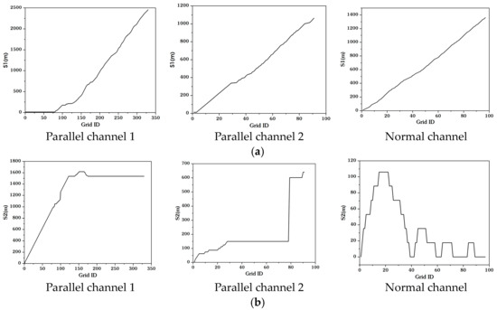 Taking the three types of channels shown in Figure 1 as examples, it is possible to analyze whether S1 and S2 can successfully identify parallel channels. From the intersection point of the two channels, S1 and S2 at different positions are calculated with a unit as the step size, and the curves of S1 and S2 are drawn (Figure 6a,b). For the curves of S1 (Figure 6a), it can be seen that if there is a channel section in the second-level channel that closely parallels the first-level channel (Figure 1a), S1 maintains a constant during the parallel section and increases rapidly when leaving the parallel section, so S1 can be used to identify the parallel channel in this case. However, S1 also increases in the unreasonable channel segment if the second-level channel is not strictly parallel to the first level channel (Figure 1b), and the trend of S1 variation is similar to the normal channel in this case. In other words, S1 cannot be applied to identify the parallel channels similar to Figure 1b.