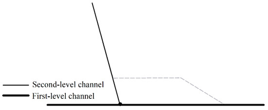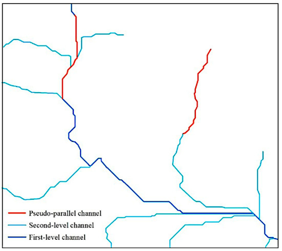 In order to identify and eliminate parallel channels, three processes are required. Firstly, the channels in a watershed should be divided into two categories, named the first-level channel and second-channel, respectively; secondly, each second-level channel should be judged if it is a parallel channel by analyzing the spatial relationship of this channel and the first-level channel; and finally, once a second-level channel is marked as a parallel channel, a new channel section should be created in a proper position, and the original section should be deleted. The following Section 2.2 and Section 2.3 will introduce the detailed method of the above processes.