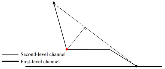 The next step is to correct unreasonable channel segments after identifying parallel channels. It is easy to deduce that the DC-Point in the second-level channel is also the position that needs correction. Then, the distances from the DC-Point to different vertices on the first-level channel are calculated, and the point in the first-level channel corresponding to the shortest distance is the new intersection point of the two channels. The corrected channel section can be created by connecting the DC-Point and the new intersection point (Figure 10).