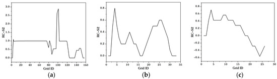For curves S2 (Figure 6b), it can be seen that if a second-level channel has an unreasonable segment (Figure 1a,b), S2 first increases from the point of intersection of the two channels and finally tends to be a constant, which is approximately equal to the distance of parallel river extension. As for the normal channel (Figure 1c), S2 increases over a short distance and then oscillates rapidly around 0. In addition, the rate of change of S2 can be calculated (Figure 6c). It can be found that compared with normal channels, the change rate of S2 near the intersection point of parallel channels is much larger, so such a characteristic can be used to distinguish parallel channels from normal channels.