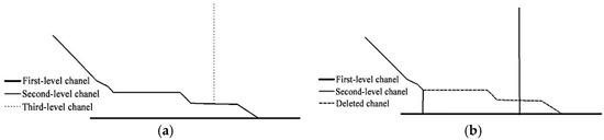 In general, the elimination of the parallel channel is completed by deleting the channel segment between its modification point and the intersection point with the upper channel. However, prior to the above process, it is necessary to verify whether there are other channels that intersect with the channel segments to be deleted. In this case (as shown in Figure 11a), it is necessary to take the vertical line from the intersection point between the two to the upper channel as the modified channel (as shown in Figure 11b) and then delete the channel segments marked to be deleted.