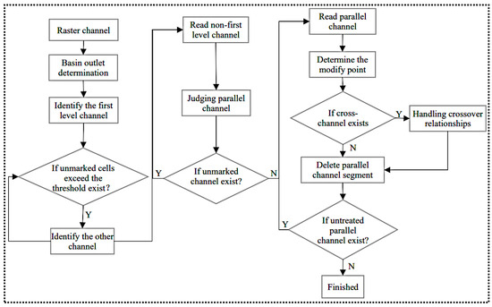 According to the above method, all channels marked as parallel channels are processed one by one, and the elimination of parallel channels in the analysis area is completed. The basic workflow for eliminating parallel channels based on DEM is shown in Figure 12, which includes the main key processes, such as channel level determination, parallel channel elimination and so on. Throughout the process, the initial channels are produced with ArcGIS 10.2 software, while the other processes are performed with VS2010-based programs written by the authors.