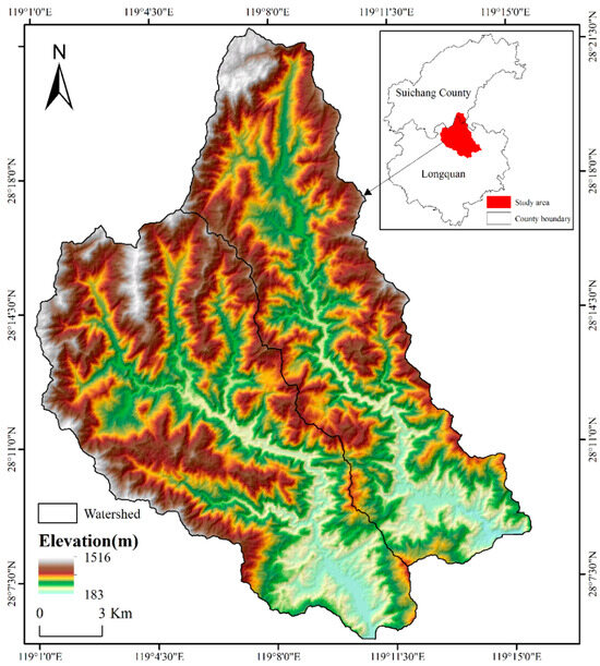 The test area selected in this paper is located near the boundary of Longquan City and Suichang County in Lishui City, Zhejiang Province. The whole area is located in the middle and upper reaches of the Oujiang River in Zhejiang Province, which is typical mountain terrain, and the surface elevation of the area varies from 183 m to 1516 m (Figure 13). Two small watersheds of the Jinshuitan Reservoir in the test area were selected for the channel network extraction and analysis. The main channels in the two watersheds belong to a U-shaped valley in surface morphology, while the tributary channels belong to a V-shaped valley, and the parallel channels are mainly distributed in the lower reaches of the watersheds where the riverbed landform is well developed.