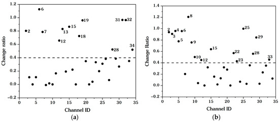 The judgement of parallel channels. (a) Watershed 1. (b) Watershed 2. (The dashed line serves as a threshold to distinguish between normal channels and parallel channels. Channels with a change ratio than the threshold are considered parallel channels, while those with a rate lower than the threshold are considered normal channels).