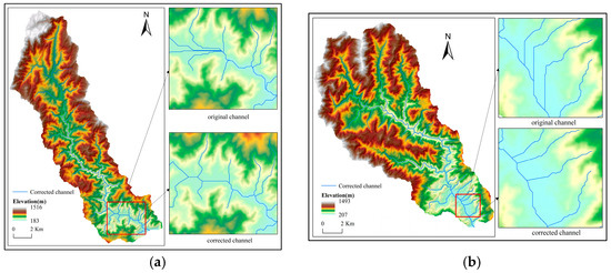 The modified channel network of the two test watersheds. (a) Watershed 1. (b) Watershed 2.