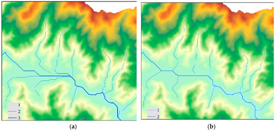 Classification of the original and corrected channel using Strahler’s method. (a) Original channel. (b) Corrected channel.