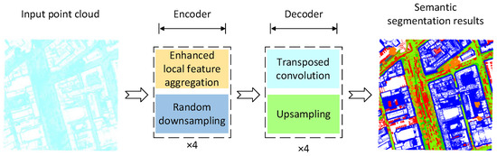 In this paper, we design a semantic segmentation network based on Enhanced Local Feature Aggregation, hereinafter referred to as ELFA-RandLA-Net. The network structure is shown in Figure 2. The proposed network uses an encoder–decoder structure. The encoder progressively extracts high-level, abstract features of the point cloud, and the decoder propagates these features to each point for point-by-point prediction. Both the encoder and decoder are four-layer structures. Each layer of the encoder includes a local feature aggregation module and point cloud downsampling, and each layer of the decoder includes an inverse convolution module and point cloud upsampling. In the encoding stage, the proposed enhanced local feature aggregation module extracts point-by-point local features, randomly samples for point cloud downsampling, and obtains global features of the point cloud through layer-by-layer feature extraction and downsampling. In the decoding stage, the inverse convolution [23] maps the global features to the low-dimensional feature space, and linear interpolation [23] recovers the number of point clouds. Finally, the network outputs the probabilistic predicted value of each point.