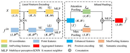 Given an input point set and its corresponding feature . For simplicity, only one spatial location is subjected to local feature aggregation in this section, while the enhanced local feature aggregation method can be applied to local feature extraction for the entire point set. denotes a spatial location in the point set (3D coordinates, ).