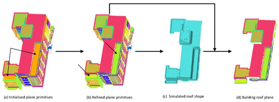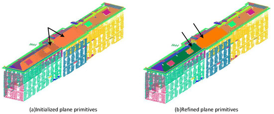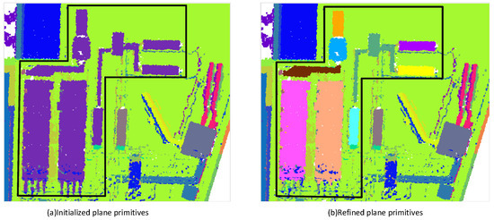 (1) Building plane segmentation. In this paper, the RANSAC [24] algorithm is used to detect the plane of the building point cloud as the initial plane primitive.