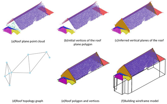 The vertical plane in the roof of a building refers to the roof plane whose normal vector is approximately perpendicular to the principal axis direction . The point cloud data of the vertical plane of a building’s roof usually have missing or defective quality, as shown in the plane pointed by the red line in Figure 6a. It makes the polygon of the vertical plane of the roof unable to accurately represent the basic structure of the building, resulting in the topological error of the roof plane, which affects the reconstruction of the building. Therefore, in this paper, the original vertical plane is replaced by the fitted vertical plane to ensure the accuracy of the topological reconstruction of the building.