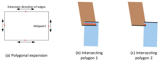 (1) Polygon outward expansion. Since there is usually an error between the regularized boundary and the real roof plane boundary (usually shrinking to the inside of the roof plane), it is necessary to externally expand the boundary of the polygon. The outward expansion process will take the midpoint of the edge to be expanded as the starting point and expand a certain distance along the direction of each of the two endpoints, and the size of the distance is usually three times the average point cloud spacing, as shown in Figure 7a.