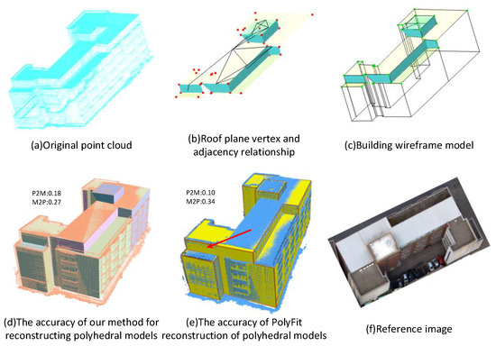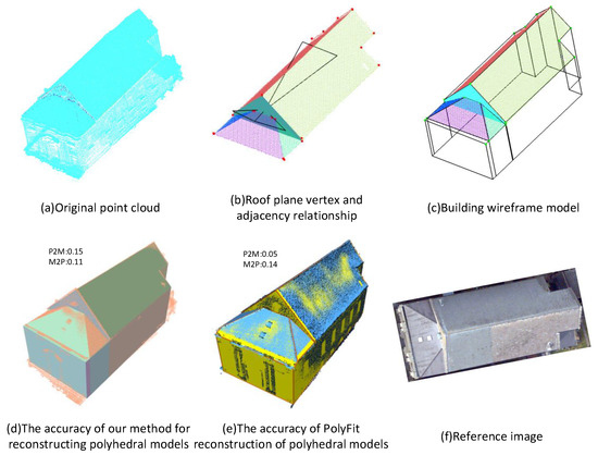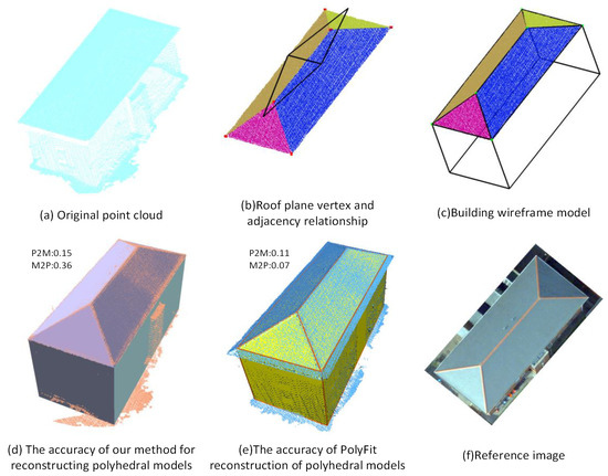 (1) The building model reconstruction method proposed in this paper mainly reconstructs the roof model of the building, while the 3D model of the building is obtained by stretching the outer contour of the roof to the ground. The proposed method mainly relies on the complete roof point cloud data, while the PolyFit building reconstruction method requires the complete point cloud data of the building, which limits the applicability of the PolyFit method to the reconstruction of point clouds of buildings in different scenes. However, the geometric accuracy (M2P) of the reconstructed model of the proposed method may be affected to some extent when dealing with buildings containing eave structures, and a comparison of the results of the reconstructed building model is shown in Figure 14d,e.