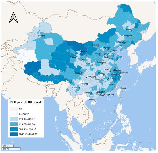The distribution of POI data normalized by population in each city is depicted in Figure 1. The findings reveal that cities with sparse populations in the western regions demonstrate a higher per capita POI count than their counterparts in densely populated cities in the eastern regions. Additionally, provincial capital cities and municipalities exhibit a higher per capita POI count compared to ordinary cities, such as Shanghai, Beijing, Wuhan, Changsha, Nanjing, Guiyang, Kunming, and Guangzhou.