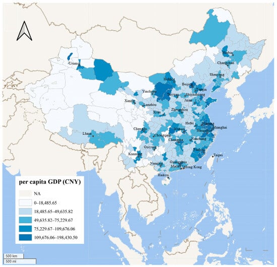 We adopted the GDP as a comprehensive indicator to measure the urban development level. The GDP is a monetary metric that quantifies the market value of all final goods and services produced by a city within a specific period. In China, the GDP encompasses various sectors, including farming, forestry, animal husbandry, fishing, industry, construction, wholesale and retail, transport, storage, post, hotels and catering, finance, and real estate. Given its broad coverage, the GDP serves as a comprehensive indicator for assessing the level of urban development [36].