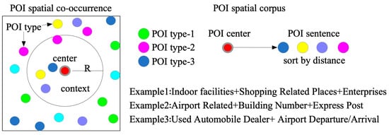 We constructed a POI spatial corpus by drawing inspiration from the corpus construction process in natural language processing. A corpus typically encompasses a vast and structured collection of texts such as documents, sentences, and words [30]. We regarded POIs as words, whereas spatially adjacent POIs formed sentences referred to as POI contexts. The complete set of POI types constituted a dictionary. Consequently, the spatially distributed POIs were transformed into a POI spatial corpus aligned with the principles of the first law of geography [31].