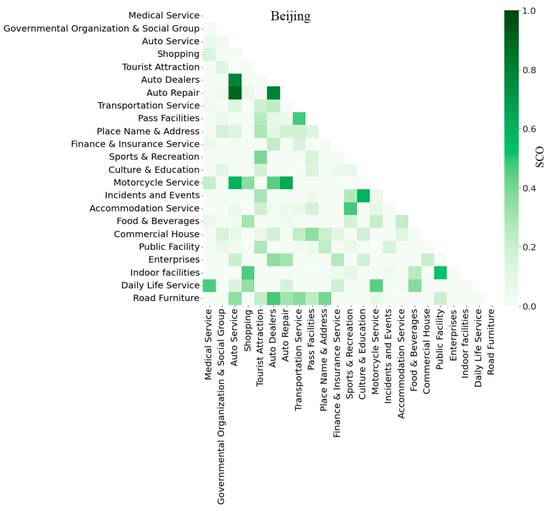 The POI co-occurrence matrix represents the spatial co-occurrence patterns of the urban functions, where the matrix values reflect the SCOs between POI pairs. Figure 6 presents the POI co-occurrence matrices for Beijing at level 1, offering a succinct depiction of their spatial relationships. Due to the abundance of POI types at level 2, the POI co-occurrence matrices cannot be clearly presented. Therefore, we focus on displaying the POI co-occurrence matrices at level 1.