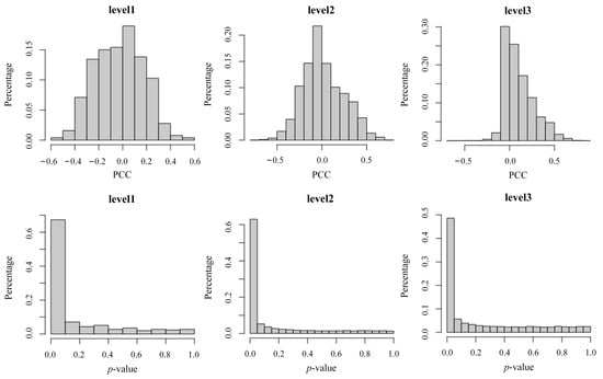 Figure 7. Histograms of PCCs and p-values between the POI co-occurrence matrix and GDP at level 1, level 2, and level 3.