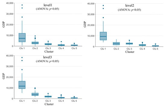 Figure 9 illustrates a decreasing trend in the average GDP values from Clu1 to Clu5. ANOVA tests conducted at Levels 1, 2, and 3 confirmed the significance (p < 0.05) of the GDP differences among the tiers. These findings provide evidence of the unbalanced nature of urban development across different tiers.