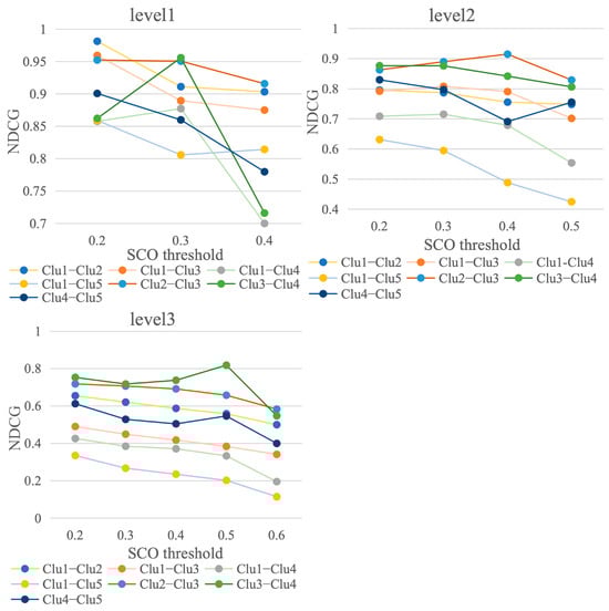 We clustered the cities into five tiers, ranging from Clu1 to Clu5. To assess the disparity in the urban hierarchy, we introduced NDCG as a measure to quantify the differences between POI co-occurrence matrices. Figure 10 illustrates the NDCGs at level 1, level 2, and level 3. The vertical axis represents NDCG, and the horizontal axis represents the SCO threshold. By selecting elements with SCO values greater than 0.2 in the POI co-occurrence matrix, NDCG was computed, focusing on contributions from significant SCOs. By weighting higher SCO values more prominently, the SCO threshold effectively assigns weights to different elements.