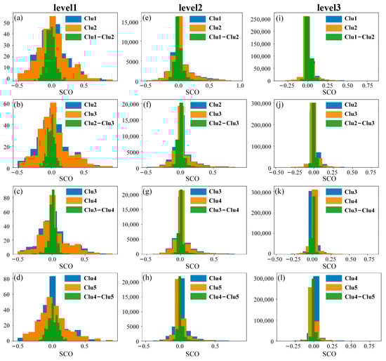 Histograms are used to illustrate the distribution of elements within this matrix to assess the rationality and validity of the urban hierarchical disparity matrix. Figure 11a shows histograms, where the horizontal axis represents the SCOs and the vertical axis denotes the frequencies. The blue and green histograms correspond to Clu1, Clu2, and “Clu1–Clu2”.