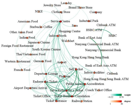 Among the nodes, the one with the highest degree is labeled as “Service Center”. This node encompasses co-occurring POI types, such as Indoor Booth, Shopping Center, Jewelry Store, Wal-Mart, Starbucks Coffee, Nike, and Sasa. The presence of Service Centers within large shopping malls signifies that first-tier cities possess more comprehensive business services than second-tier cities. We could identify the community of Foreign Food Restaurants, which contains Japanese Cuisine, American Food, French Food, German Food, South Korean Cuisine, Other Asian Food, Indian Food, and Thai/Vietnamese Food. Foreign restaurants fall under high-end catering consumption, and first-tier cities exhibit a more widespread presence of high-end catering compared to second-tier cities. Additionally, there is a clustering of transportation communities, including Airport, Railway Station, Ticket Business Correlation, and Departure Lounge, implying that first-tier cities boast more advanced transportation facilities than second-tier cities. The figure also highlights the appearance of nodes associated with Industrial Park, Company, and Banks (such as HSBC, Nanyang Commercial Bank, and Citibank), indicating the thriving commercial environment prevalent in first-tier cities.