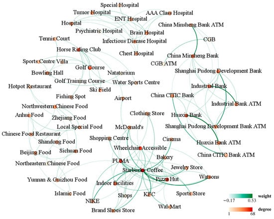 Figure 14 depicts the disparities in urban functions between second- and third-tier cities. The graph reveals several distinct communities, including hospitals (AAA Class Hospital, Special Hospital, Chest Hospital, Brain Hospital), banks (Industrial Bank, China Minsheng Bank, Huaxia Bank, China CITIC Bank), and Noble Sports (Golf Course, Horse Riding Club, Bowling Hall). In comparison to Figure 12, the spatial co-occurrence patterns of foreign restaurants decreased. There is an emergence of Chinese local dining, such as Chinese Food Restaurant—Anhui Food, Local Special Food, Sichuan Food, Shandong Food, Islamic Food, Beijing Food, Yunan and Guizhou Food. The spatial co-occurrence patterns of Shopping Mall (Wal-Mart, Watsons, Brand Shoes Store, Sports Store, Nike, KFC, Pizza Hut, Bakery, Starbucks Coffee) no longer revolve around the Service Center. These communities illustrate the superiority of second-tier over third-tier cities in terms of healthcare facilities, banking services, sports amenities, and catering.