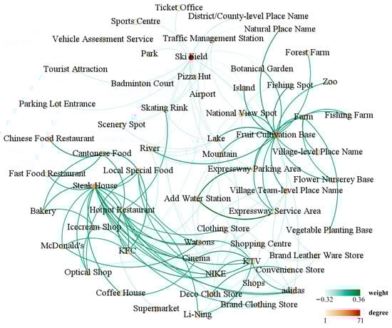Figure 13 illustrates the disparities in urban functions between the first- and second-tier cities. The nodes in the graph represent specific POI types, and the edges represent variations in urban functions. The colors of the nodes and edges correspond to their respective degrees and weights, where higher values indicate greater differences between the two tiers.