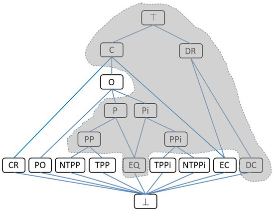 The subsumption hierarchy of RCC*-9 relations. A link between two relations represents an implication from the lower one to the upper one. The shaded area includes the relations that have the same syntactical definitions as in RCC-8.
