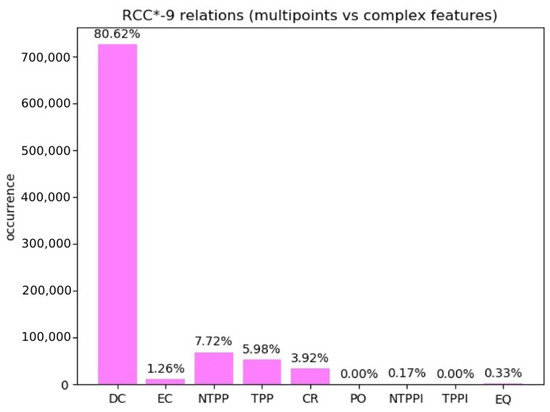 The choice of spatial entities in the experiments influenced the results, and different choices would have resulted in different percentages of relations. Priority was given to maximizing the chance that all relations were represented. In real scenarios, e.g., with a large environment size, the DC relation would be much more likely. If the features had a similar size, the PO relation would be more common and the P relations would be rare. To obtain EC relations, it was necessary to include features with regular patterns, e.g., with the constraint that boundaries lie on a grid. Overall, the random feature generators produced features bounded in a limited environment, with sets of larger features and smaller features (up to one-tenth of the larger) and imposing a constraint that the feature coordinates were a multiple of the given initial patterns. In future work, it would be interesting to evaluate the percentage of relations between features in real environments. It will be necessary to run more experimental work on faster processors, perhaps exploiting GPUs, especially for the 3D cases.