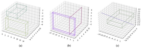 (Simple lines). We considered a random set of simple lines (100 were polylines with 7 vertices, 100 horizontal segments, and 100 vertical segments). The number of calculated compositions is similar to the previous experiment. The composition table (Table 2) reveals that there are more composition cases that were not included in Clementini and Cohn [35]. These additional cases are , , , , and . From the composition table, we can also see that there are cases that are not possible for simple lines but that were possible for complex regions: , , , , , , , and .