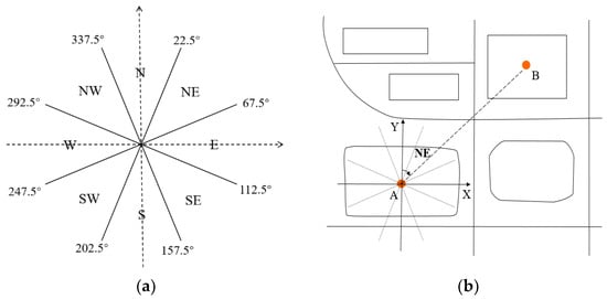 The qualitative orientation relationship describes the relative positions of spatial objects. In people’s orientation, polygon spatial objects are often represented by a point, and their qualitative orientation relationships are described. In this study, we used the eight cone-shaped directions model proposed by Frank [] to analyze the qualitative orientation relationship of landmarks. This model divides the spatial plane into eight mutually disjointed directional regions, and each ‘cone’ has equal angles denoted as E, SE, S, SW, W, NW, N, NE (Figure 4a). First, we found the center of gravity of each landmark in the sketch map and then calculated the direction angle between the two centers of gravity. Based on the area pointed by the direction angle in the model, we obtained the qualitative orientation relationship between the two landmarks. As shown in Figure 4b, B is located northeast of A. We used this method to calculate the orientation relationship of all landmarks in the sketch map and compare the results with the OSM.