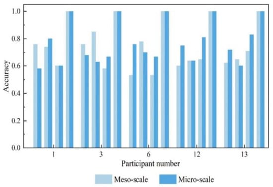 The evaluation of spatial relationships in sketch maps at different scales is a key point in this study. The boxplot in Figure 9 shows the statistical results of sketch maps at different scales. It shows the degree of dispersion of the spatial relationship accuracy of the elements in the sketch maps at meso and micro spatial scales within a quantile range of 20–80%. The qualitative orientation relationship of landmarks and the order relationship of landmarks along the main road are generally equivalent in meso- and micro-scale sketch maps. Our evaluation indicates that changing the spatial scale has little effect on the sketch maps’ qualitative orientation and order relationship. An analysis of the landmarks’ qualitative distance relationship showed that the results of the micro-scale sketch maps were better than that of the meso-scale ones. The spatial area involved in the micro-scale sketch map is smaller than that of the meso-scale, and people’s cognitive ability regarding the distance of geographical elements in the micro-scale is stronger than that in the meso-scale. The topological relationship between generalized city blocks and landmarks shows better results for both spatial scales, with micro-scale sketch maps being more accurate than meso-scale ones. Since the meso-scale study area is larger and contains more geographical elements, people have a vague cognition of the spatial distribution of some elements; therefore, the misjudgment rate is higher. This experiment indicates that spatial scales affect some analysis results of spatial relationships in sketch maps.