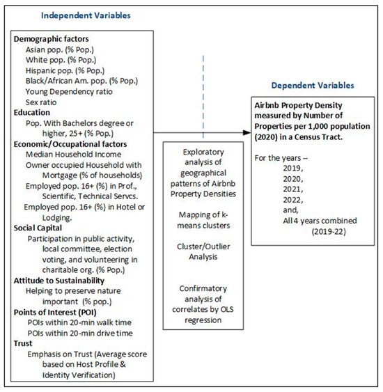 In summary, the conceptual model provides an understanding of the spatial arrangement of Airbnb property densities and clusters, and it examines the relationships of Airbnb property densities to a range of variables that are induced from the literature or author reasoning to be related to the dependent ones.
