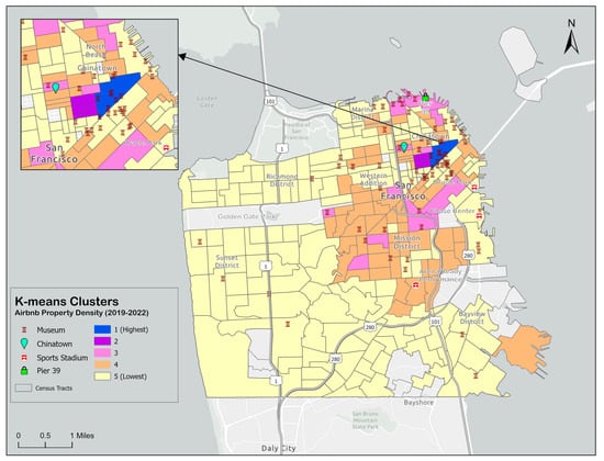 From Figure 3, it is evident that the census tracts belonging to clusters 1, 2, and 3 in which Airbnb property density is very high to moderately high are all concentrated north of Market Street in the northeastern periphery of the city, which is a hotspot of tourism, cultural attractions including museums, and related diversity. The four census tracts of clusters 1 and 2 are spatially contiguous and are located in San Francisco’s Financial District, in close proximity to Chinatown, a noted ethnic enclave of San Francisco. Members of cluster 3 are located both north and south of the census tracts in clusters 1 and 2, around tourist attractions such as Pier 39, which is home to retail and dining establishments and offers panoramic views of the San Fransisco Bay. These tracts are located on either side of U.S. 101 which cuts through downtown San Francisco providing a major gateway into the city. Cluster 4 census tracts surround the census tracts of clusters 1, 2, and 3, and have moderate-low Airbnb host participation. They are dispersed over several neighborhoods such as Haight Ashbury and Barnal Heights in Mission District, Marina District, and Chinatown in the central core and northeastern periphery of the city and include commercial and sports venues such as the Chase Center and Oracle Park, which are home of the city’s NBA and MLB franchises. One single census tract that belongs to cluster 4 is the location of San Francisco International airport, which is in close proximity to a number of hotels and lodging facilities. Cluster 5 census tracts, which accounts for almost two-thirds of the study area, are located away from downtown San Francisco and the city’s central business district for the most part in the city’s Bayview, Sunset, Richmond, and Marina districts. These tracts of the lowest Airbnb densities surround the central business district high Airbnb-density tracts of clusters 1 and 2. This is not unusual in central areas of US cities (consider, for example, that high Airbnb zip codes of mid-Manhattan and northern Brooklyn are surrounded by the low and lowest high Airbnb-density zip codes []. Viewed as a whole, the clusters grow outward from the city’s northeastern periphery where property densities are highest to the city’s core and western and southern fringes where property densities are the lowest. This is a contrast to Los Angeles, California, in which the distribution of Airbnb supply has a center-periphery pattern [].
