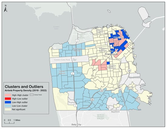 Since Moran’s I is unable to uncover spatial heterogeneity and identify spatial clusters and outliers, local indicators of spatial association (LISA) analysis [] was also conducted to determine spatial clusters and outliers of Airbnb density in the study area. Clusters and outliers are mapped in a GIS to visualize and subsequently contextualize statistically significant hotspots, coldspots, and outliers of Airbnb property density in San Francisco’s census tracts.