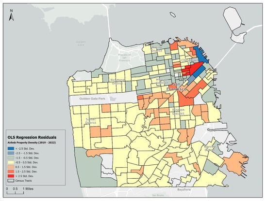 Finally, ordinary least squares (OLS) regression analysis is conducted to examine the associations of the sixteen independent variables with the thirteen dependent indicators of property density. OLS regressions were conducted in two batches, first for five dependent variables that represent densities for the combined years 2019–2022 and for each year, 2019, 2020, 2021, and 2022. The objective was to diagnose changes in OLS regression results over time, which would indicate a shift in host motivations to participate in Airbnb STR marketplace. The second batch of OLS models featured eight dependent variables, split in half for entire home/apartment and private room, the two main property types, for the aforementioned years. The variance inflation factor (VIF) was calculated for each OLS model and a VIF cutoff of 5.0 was used as a threshold of multicollinearity. VIF values greater than 5.0 indicate redundancy among explanatory variables. No multicollinearity problems were detected for any of the OLS models. For each OLS model, regression residuals are mapped in a GIS to visualize spatial patterns in terms of randomness versus agglomeration. The extent of spatial randomness is determined by computing Moran’s I of regression residuals. These Moran’s I values are compared with the Moran’s I values of the Airbnb property density dependent variables to gauge if the OLS models have been able to account for the presence of any spatial bias in the dependent variables themselves.