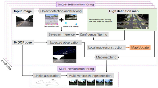 In our everyday lives, dynamic changes occur in the road environment. For example, lane lines can be removed when the road is coated with new asphalt; arrow markers on the road can differ due to local regulation changes; centerlines can be moved for the expansion of the lane width. These add to the number and complexity of tasks that need to be performed by specialized mapping vehicles. Previously, whenever a map needed to be updated, the specialized mapping vehicle will update the map as a whole. As a result of the high workload during an update, the frequency of updates in the necessary areas are relatively low [11]. To avoid the ineffective allocation of resources and reduce the burden of performing these map updates, specialized mapping vehicles should only be dispatched to areas that require updates on the map [12]. In this paper, we aimed to identify these specific out-of-date areas by outsourcing the detection of changes to the road environment to mass-produced vehicles equipped with low-cost sensors such as monocular cameras and GNSS. The visualization of the monitoring system can be seen in Figure 1.