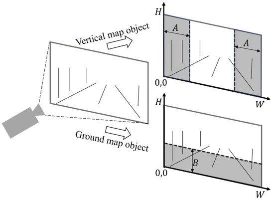 The map element association between two time frames is performed by finding the minimum Manhattan distance between the previous prediction and the detected map object in the next time frame. When the predicted pixel locations of the vertical objects (poles and signs) are outside of the image border = and the ground objects (lane lines) are outside of the image horizon , the tracking of that element is finished. The visualization of this limit can be seen in Figure 3.