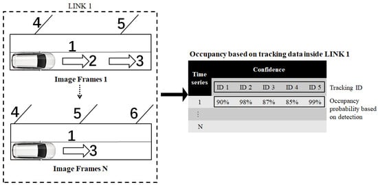 When the detected map element is registered as tracked, we put the confidence value inside an occupancy object table in a time series manner as . It is important to note that, for the case of missing tracking, the occupancy table is also filled with . The observation of the map element in the image plane is modeled as a series of occupancy objects, as shown in Figure 4. This occupancy object works as an occupancy grid, but instead of using the grid as a reference, we used the map element itself as the reference. These occupancy objects will be used in the next step when we want to calculate the existence confidence of the map element.