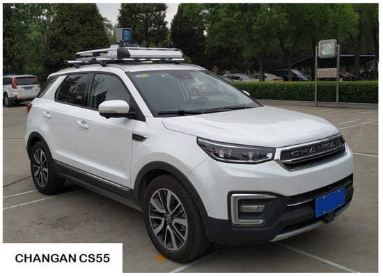 We simulated multi-session monitoring by traversing across Beijing Yizhuang District multiple times. Each time, the distance traveled was between 10 and 20 km. Therefore, several linklet areas were passed by the vehicle. Our experimental vehicle was equipped with a monocular camera with 1080p resolution recording at 10 fps. We also equipped the vehicle with an IMU sensor, gyroscope, and wheel encoder at 100 Hz. Although the vehicle was equipped with a Hesai 40P LiDAR sensor, the main localization tool used was GNSS-RTK to obtain high-precision positioning. The vehicle’s sensor details can be seen in Table 1, and the vehicle itself can be seen in Figure 8.
