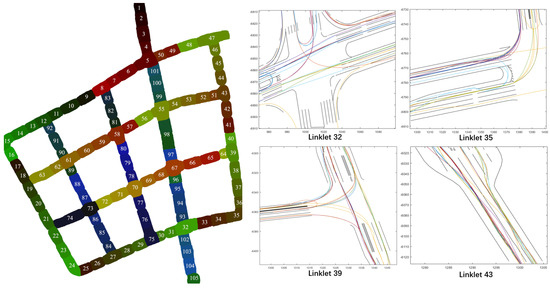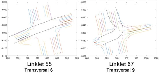 Following the approach of partitioning the map into several linklet areas by Pannen et al. [16], we are able to deploy our method for a large-scale map. We first created a cluster of vehicles passing each of the linklet areas to collect the vehicle data according to the trajectory taken by each vehicle. The visualization of the linklets’ area can be seen in Figure 7. In this process, we denote that, for each linklet , the linklet transversal sets are . For each transversal, we can receive information of the three parameters .