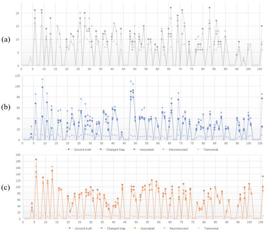 In this subsection, we want to analyze the specificity of our monitoring algorithm. Figure 10 shows the amount of observations for each constructed map element in each of the linklet areas. It can be seen that there are some linklets that have no observations whatsoever, which is because not all the linklet areas are being passed by the vehicle. Here, we can see that, in most cases, the value of the ground truth and that of the reconstructed map element do not differ much. The association value is also close to the value of the changed map, which indicates that our method was able to find the change in the linklet. Given that we can observe most of the information the map provides to the vehicle, yet the vehicle is able to reconstruct additional details, this implies that the map lacks sufficient information, hinting at a need for updates or changes.