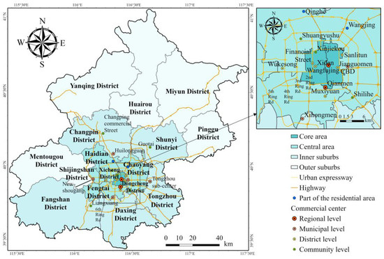 Beijing has a total area of 16,410.54 km2, with 16 municipal districts under its jurisdiction. As we will explore differences among urban circles in terms of the spatial association between commercial sites and residences, we divide the city into four circles according to the Beijing Urban Master Plan (2016–2035): core area, central area, inner suburbs, and outer suburbs (Figure 1). The commercial centers in Beijing have four levels, namely, regional, municipal, district, and community (Figure 1).