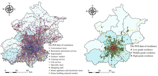 Beijing is one of the top 10 commercial cities in China and has a long history of commercial development and a variety of commercial functions. Beijing’s commercial spaces have gradually evolved from an early monocentric and pyramid-type structure to a polycentric and flattening structure with commercial centers showing complex formats during the past few decades [46]. Social segmentation and residential differentiation in this city have grown in importance because of housing marketization and rapid suburbanization [47,48]. The concentrated population and functions in Beijing have caused a series of serious metropolitan problems, such as traffic congestion, housing shortage, and high prices. Thus, since 2005, the Beijing government has initiated an urban master plan to relocate residential function and some industries from the city core. On the basis of the existing satellite towns, 11 new towns were planned to decentralize the population and urban functions of the city core. The suburbanization of residential function has been successful, whereas the diffusion of commercial facilities to the suburbs remains relatively insufficient, leading to a mismatch between commercial and residential spaces [49]. Thus, given the prominently uneven distribution of commercial facilities and residences in Beijing, it is an ideal city for the study on spatial association between commercial sites and residences.