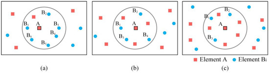 where is the degree to which elements A are attracted by elements B; is the number of all elements in the study area; is the number of elements A; is the number of elements B; is the number of elements A having elements B as their nearest neighbors; is the proportion of elements B having elements A as their nearest neighbor in the study area; and is the proportion of elements B that are the nearest neighbors of elements A in a random situation; indicates that the association between elements A and B is asymmetric, and its value can reflect the spatial association degree between the two elements. If is greater than 1, then the spatial association between elements A and B is strong, and elements A tends to be attracted by elements B. If is less than 1, then the attraction of elements B to elements A is weak, and the distributions of the two elements tend to be scattered. If is equal to 1, then elements A and B tend to be randomly distributed (Figure 3).